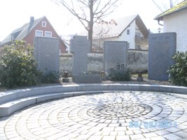 Denkmalsanlage am Eingang des Friedhofes. Granitsteine mit Inschrift und Namen der Weltkriegsopfer. Leuchten und Bepflanzung, als Zierde
