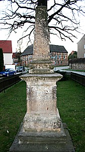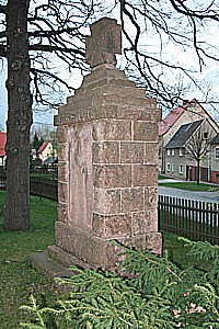 In einem kleinen eingezäunten Areal befinden sich zwei Stelen. Das aus rotem Sandstein im Jahre 1923 errichtete Denkmal ist den Gefallenen des 1. Weltkrieges gewidmet. Das zweite Denkmal wurde im Jahre 1875 geschaffen. Es besteht im Wesentlichen aus einer ehemaligen kursächsichen Postdistanzsäule, die man aus Pegau heran geschafft hat
