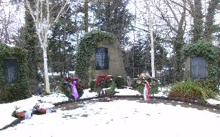 Auf dem Ortsfriedhof drei graue Steinblöcke mit daran angebrachten Marmorplatten.