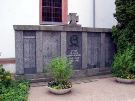 Im Garten vor der evangelischen Kirche befinden sich zwei Denkmäler, die an den Krieg von 1870-71 und die Gefallenen des 1. und 2. Weltkrieges erinnern sollen. Der auf der linken Seite aufgestellte Sandstein-Obelisk von 1870-71 ist vorne mit gekreuzten Kanonen, Fahnen und einem Löwen-Wappen verziert. Auf drei Seiten befinden sich die Namen der Gefallenen und Kriegsteilnehmer.