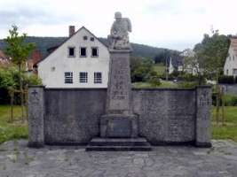 In der Mitte ein Steinobelisk, mit einem knienden Soldaten, vorne mit einer Spruchplatte aus Stein, darunter eine Spruchplatte aus Metall. Links und rechts an den Obelisken angebracht zwei Namensplatten aus Stein. Als Abschluss auf beiden Seiten je eine Steinsäule mit Jahreszahlen