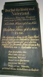 Gedenktafeln 1866 Den ruhmreichen und ehrenvollen Tod starben in Österreich am 3. Juli 1866 b. Königgrätz Hermann Heberer Füsilier 12.Comp. 2.Gard. Regmt. Zu Fuß Gewidmet vom Gesang-Verein Liederkranz zu Clüden am 3. Juli1867 Den ruhmreichen und ehrenvollen Tod starben in Österreich am 28. Juni 1866 b. Münchengrätz Gottfried Fehse Füsilier 10.Comp. 1. Magdeburgische Inf. Regiment N.26 Gewidmet vom Gesang-Verein Liederkranz zu Clüden am 28. Juni1867