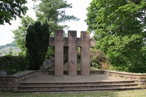auf einem Platz hinter der Ruine Saarburg; drei Kreuze mit Inschriften (ohne Namen); zusätzlich Hinweise zu Soldaten von privaten Gedenksteinen