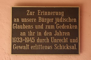 Gedenktafel: Zur Erinnerung an unsere Bürger jüdischen Glaubens und zum Gedenken an ihr in den Jahren 1933-1945 durch Unrecht und Gewalt erlittenes Schicksal.