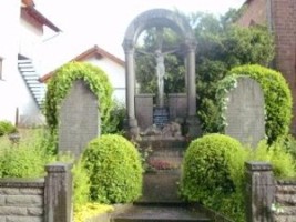 Vor der Kirche St. Wolfgang befindet sich das Kriegerdenkmal. In der Mitte ein Kreuz, das von einem offenen Gewölbe geschützt wird, welches von 5 Säulen getragen wird. Am Kreuz stehen zwei Namens- und eine Inschriftentafel aus Stein. Vor dem Kreuz eine Figur eines sterbenden Soldaten. Links und rechts daneben, freistehend zwei weitere Namenstafeln aus Stein (2. WK), jede mit eingemeißeltem Stahlhelm.