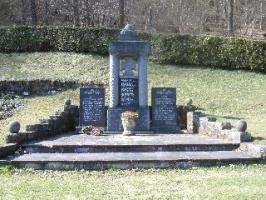 Das Kriegerdenkmal befindet sich auf dem Friedhof. - Auf einem kleinen Sockel stehen vier Säulen die eine Steinplatte tragen, auf der ein Stahlhelm ruht. Zwischen den Säulen befindet sich eine Namensplatte aus Marmor mit einem aufgesetzten Kreuz. - Links und rechts stehen Gedenksteine aus Marmor.