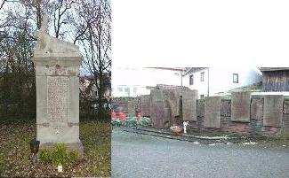 Auf dem Friedhof: Steinsäule; als Abschluss ein gefallener Jesus mit Kreuz. An der Lukaskapelle: Ehrenmal aus sechs Sandsteinplatten von denen fünf mit Namen versehen sind. Inmitten dieser Platten befinden sich drei übereinander abgebrachte Kreuze aus Sandstein.
