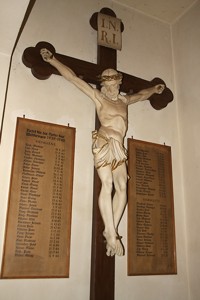 in der Kirche; eine Gedenktafel (1. Weltkrieg) und zwei Gedenktafeln dazwischen Kruzifix (2. Weltkrieg)