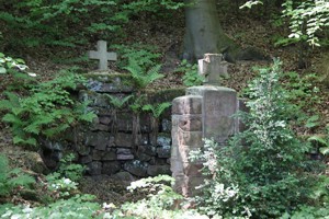 Wasserliesch (1. Weltkrieg), Landkreis Trier-Saarburg, Rheinland-PfalzPLZ 54432 In einem ehemaligen Steinbruch, ca. auf halbem Weg von den Tennisplätzen zur Löschemer Kapelle; halbrunde Stützmauer mit Kreuz, etwas davor gemauerte Steinsäule mit Kreuz, Inschriften