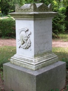 Marmorblock auf Sockel mit Inschrift auf der Vorderseite: Im Glauben ist die Liebe zu Gott! Die Liebe höret nimmer auf! Zusammen mit Elise von Kronhelm gest. 1872 im Alter von 21 Jahren Eine Seite: Wappen, eine Seite: Helm und gekreuzte Schwerter