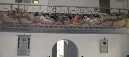 Denkmal Findling Stein WK 1, In Kirche bemalte Empore mit Apokalyptischen Reitern für WK 1, Tafeln 1815, 1871