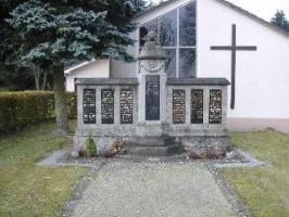 Neben dem Friedhof, vor der Aussegnungshalle eine Steinsäule, daran rechts und links angefügt zwei Steinwände an denen je drei Marmorplatten befestigt sind. – Namen ohne Zuordnung zu den Kriegen