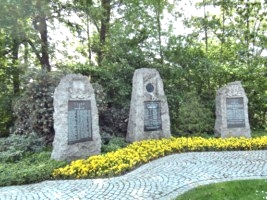 Der Gedenkstein wird rechts und links flankiert von zwei entsprechenden Blöcken mit Tafeln für die Gefallenen und Vermissten des zweiten Weltkrieges.