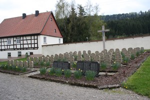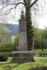 im Friedhof: 1.Gedenktafel außen an der Abdankungshalle 2. auf einem Sockel stehende Säule, oben mit Kugel und Kreuz, vorn Steinrelief „Soldat“ (1. Weltkrieg); 3. Steinkreuze für die Gefallenen, vorne rechts zwei Gedenktafeln für die Vermissten, hinten Hochkreuz (1. Weltkrieg+2. Weltkrieg); 4. zusätzlich Hinweise zu Soldaten von privaten Gedenksteinen