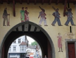 1. am Graben; auf einem Sockel stehender Mann, Inschriften am Sockel 2. Oberturm; auf der Innenstadt zugewandten Seite, Bilderzyklus „Aufgebot 1914“