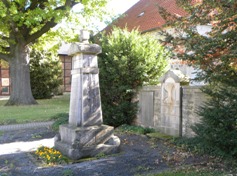 Vor der Kirche das Ehrenmal für die 20 Kriegstoten des Ersten Weltkrieges, dahinter an der Mauer zwei Gedenktafeln mit den 54 Namen der Opfer des Zweiten Weltkrieges.