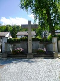 Steinernes Kreuz vor einem ummauerten nach vorne offenen Steinsockel. An der hinteren Wand die Toten des 1. Weltkrieges, rechts und links die des 2. Weltkrieges,. An die Rückseite des Kreuzes gelehnt eine Metalltafel mit den Toten des 70er-Krieges.