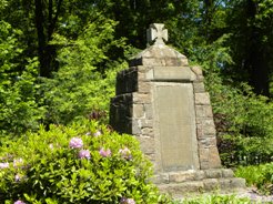 In einer gepflegten Anlage das Ehrenmal für die Kriegstoten beider Weltkriege in Form einer stumpfen Pyramide,
