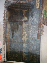 Steindenkmal mit grossem Kreuz (ohne Namen), Gedenktafeln in Kirche, Bemalte Empore in Kirche mit Namen der Gefallenen des 1. Weltkriegs