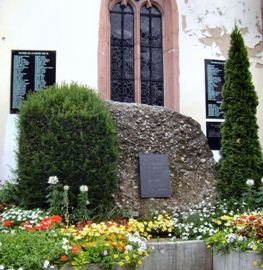Ehrenmal neben der Kirche St. Martin. – An einem Konglomeratstein hängt eine Metalltafel mit Inschrift. Rechts und links davon befinden sich an der Außenwand der Kirche schwarze Tafeln mit den Namen der Kriegsopfer.