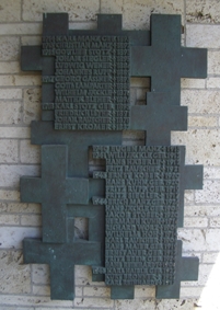 Aus übereinander liegenden Kreuzen bestehende Metalltafel auf dem Friedhof in Apfelstetten mit den Namen der Gefallenen beider Weltkriege