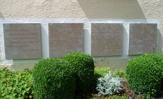 Steinerne Gedenktafeln an der Außenmauer der Ditzenbacher Kirche mit den Namen der Toten beider Weltkriege.