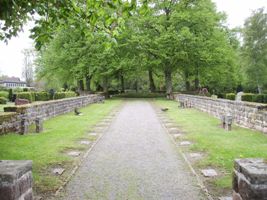 Große zweigeschossige Anlage. Im Untergeschoß Natursteinmauer mit Bronzeplatten (Namen). Über zwei Treppen erreichbare baumbestandene Allee beginnend mir großem Steinkreuz, links und rechts Einzelgräber, meistens 1. Weltkrieg. Die Allee endet in einem Rondell. Seitlich der Anlage weitere Einzelgräber 2. Weltkrieg.