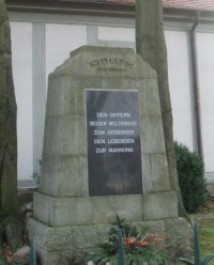 Das Denkmal vor der Kirche war bis 1945 ein Kriegerdenkmal für die Gefallenen des 1. Weltkriegs. Die Namenstafel wurde danach entfernt und eine allgemeine Tafel eingesetzt. Die Gedenktafel von 1763 zum Frieden von Hubertusburg (dem Ende des Siebenjährigen Krieges) ist in der Mitte zerstört und durch ein neues Brett ersetzt. Einige Namen sind dadurch verloren. Der obenstehende Text konnte von der gleichförmigen Tafel in der Kirche Sommerfeld rekonstruiert werden, nur der Schlussspruch ist anders und nicht mehr sinngemäß zu verstehen.