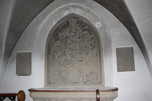 in der Kirche St. Michael; in einer Seitenkapelle, Steinrelief in einer Nische und acht steinerne Tafeln an den Wänden