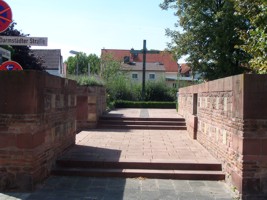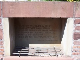 Schriftzüge und Wappen von Mainz aus dem Jahr 1932 auf den Kopfsteinen am Eingangsbereich der „Heiligen Straße“: VERWEILE DU WANDERER UND GRÜSE SIE GEDENKSTÄTTE FÜR DIE GEFALLENEN 1914-1918 1939-1945 Schriftzug im Seitenteil der Mauer: ERRICHTET VON BÜRGERN MAINZ-BISCHOFSHEIMS ALS ZEICHEN IHRES DANKES TROTZ WIRTSCHAFTSNOT UND ARBEITSLOSIGKEIT IM JAHR 1932. GEMAUERT MIT STEINEN DER GESCHLEIFTEN FESTUNG MAINZ UND VOM UMBAU DER STRASSENBRÜCKE. Schriftzüge rechts und links oben in der Mauer: (Ehrenkreuz) DEN TOTEN ZUM GEDÄCHTNIS (Ehrenkreuz) DEN LEBENDEN EIN VERMÄCHTNIS Schriftzug über dem Brunnen in der Mauer: „HEILIG DIE STRASSE, DIE DU GEHST, HEILIG DIE STÄTTE, DA DU STEHST, HEILIG DAS SEHNEN, HEILIG DER TRÄNEN FLIESENDE FÜLLE, HEILIG DER WILLE, DER STILL SICH BEZWINGT, HEILIG DAS ZIEL, DAS TRÖSTEND WINKT.“ Von Pfr. Friedrich Heddäus
