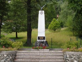Bruchsteinsockel mit Granate. Stele aus hellem Marmor mit dunkler Tafel, EK und Adler und den Namen der Gefallenen aus WK 1. Seitlich zwei helle Tafeln mit den Namen der Gefallenen aus WK 2. Das Denkmal befindet sich neben der Bleiberger Landesstrasse bei Kilometer 15,920.
