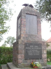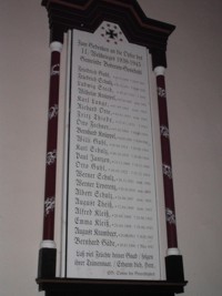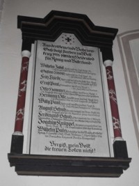 Tafel 1. Weltkrieg: Aus der Gemeinde Boberow – Gosedahl starben im Weltkrieg 1914-1919 den Heldentod für König und Vaterland. Vegiß mein Volk die treuen Toten nicht.