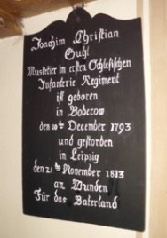 Tafel 1815: Joachim Christian Guhl, Musketier im ersten Schlesischen Infanterie Regiment ist geboren in Boberow den 10ten December 1793 und gestorben in Leipzig den 21ten November 1813 an Wunden. Für das Vaterland.