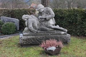 Bochingen (Soldatengrab), Stadt Oberndorf am Neckar, Landkreis Rottweil, Baden-WürttembergPLZ 78727 im Friedhof; Steinplastik auf einem Sockel „Soldat kniet vor Verstorbenen“, etwas daneben vier Steine