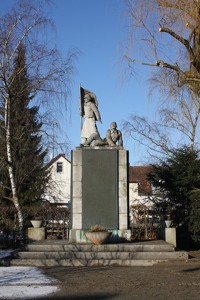 in der Nähe vom Friedhof; auf einem 3-stufigem Podest, rechteckige Säule, oben Steinplastik „zwei Soldaten“, Gedenktafel vorne; zusätzlich Hinweise zu Soldaten von privaten Gedenksteinen