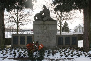 im Friedhof; Betonwand mit Gedenktafeln, mittlerer Teil vorspringend und erhöht, oben Steinplastik „Soldat und Verstorbener“