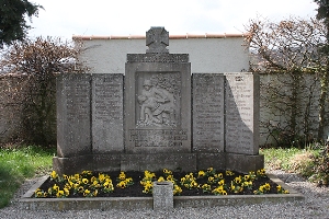Im Friedhof eine freistehende Gedenkwand, in der Mitte ein Steinrelief „Soldat tröstet Sterbenden“; zusätzlich Hinweise zu Soldaten von privaten Gedenksteinen