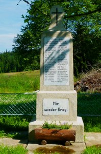oben: 1914 - 1918 Den treuen Helden die dankbare Heimat, unten: Nie wieder Krieg, Blumenkiste davor: Bucherser Heimat Verein