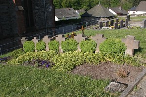Soldatengräber: im Friedhof; eine Reihe von 6 Steinkreuzen und ein einzelnes Steinkreuz beim Kriegerdenkmal