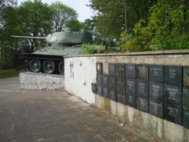 Schrift) vor dem ein T34 Panzer steht. Auf der deutschen Kriegsgräberstätte sind auch 10 Unbekannte bestattet,
