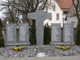 Bei der Kirche vier stehende Marmortafeln, dazwischen ein Marmorkreuz; zusätzlich Hinweise zu Soldaten von privaten Gedenksteinen