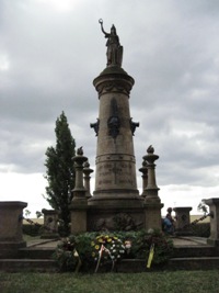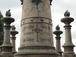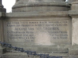 Grabmal der Totenbatterie des österreichischen Hauptmanns von Groeben, der 1866 den österreichischen Rückzug deckte, errichtet 1893. 10 Meter hohes Denkmal aus Sandstein bekrönt mit der zwei Meter hohen Statue der Austria mit Schutzschild und Lorbeerkranz in den Händen und verziert mit Helm, Kanonenschlünden, Köpfen von Medusen, Eichenkranz und Palmzweig aus Bronzeguss, im Sockel mit einem sterbenden Löwen auf Trümmern eines zerschlagenen Geschützes en relief, ist vom Komitee zur Erhaltung des Denkmal auf dem Königgrätzer Schlachtfelde mit Beihilfe des Maria-Theresien-Ordens und der österreichischen Artilerie-Waffe gestiftet, und „den Helden der Batterie der Todten“, namentlich aber auch dem Kommandten der österreichischen Kavallerie-Batterie Nr. 7/VIII, Hauptmann August van der Groeben, dem Oberleutnant Heinrich Wolf und 52 Mann der Batterie gewidmet.