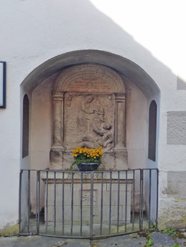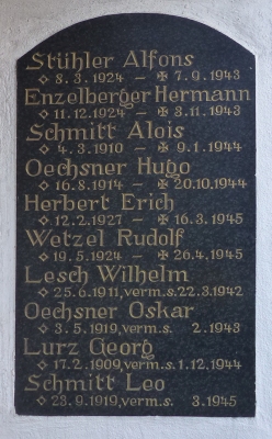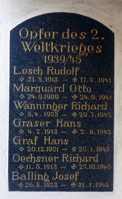 Das Kriegerdenkmal befindet sich in einer bogenförmigen Nische neben dem Eingang in die Kirche. In der Mitte ist eine Sterbeszene dargestellt, darüber die Inschrift. Unten die Namen der Gefallenen des 1. Weltkriegs. Links und rechts davon sind zwei Marmortafeln mit den Namen der Gefallenen des 2. Weltkriegs in die Wand eingelassen.