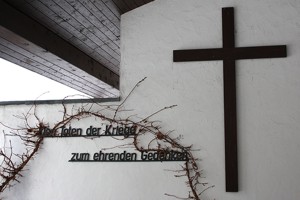 Auf dem Friedhof; Inschrift an der Friedhofskapelle, daneben Kreuz (ohne Namen)