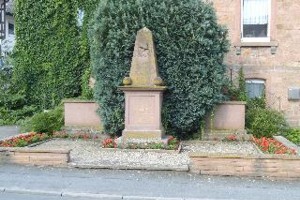 In der Ortsdurchfahrt stehend, eine Sandsteinstele. Im oberen pyramidenförmigen Teil ist ein Stahlhelm, so wie ein Eichenlaubkranz herausgearbeitet. Links und rechts daneben, freistehend, zwei Gedenktafeln aus Sandstein.