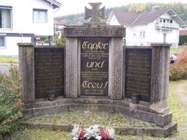 In einer kleinen Grünanlage, neben der Josefskapelle (1860-61) befindet sich ein dreiteiliges Denkmal für die Gefallenen des 1. und 2. Weltkrieges. Der Abschluss des Mittelteils wird oben durch ein großes, steinernes Ehrenkreuz mit einem Schriftzug gebildet. Darunter im unteren Mittelteil ist eine Inschrift. In den Seitenteilen links und rechts sind die Namen in goldener Schrift auf schwarzem Grund verzeichnet.