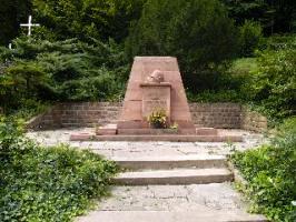 Ehrenmal der Stadt – eine konisch zulaufende, aus Sandsteinen gemauerte Säule ohne Spitze. Vorne mit einem Altar auf dem