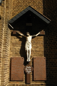 Eckendorf, Gemeinde Grafschaft, Landkreis Ahrweiler, Rheinland-PfalzPLZ 53501 Außen an der Kirche von Eckendorf, direkt neben dem Eingang, befinden sich links und rechts von einem Kruzifix zwei Steintafeln mit den Namen der Gefallenen des 1. und 2. Weltkrieges.