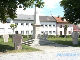 Denkmalsanlage neben der Pfarrkirche. Mittig ein sich nach oben verjüngender Obelisk auf einem Treppenpodest