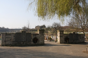 Im Friedhof Gedenktafeln an einer Mauer; zusätzlich Hinweise zu Soldaten von privaten Gedenksteinen